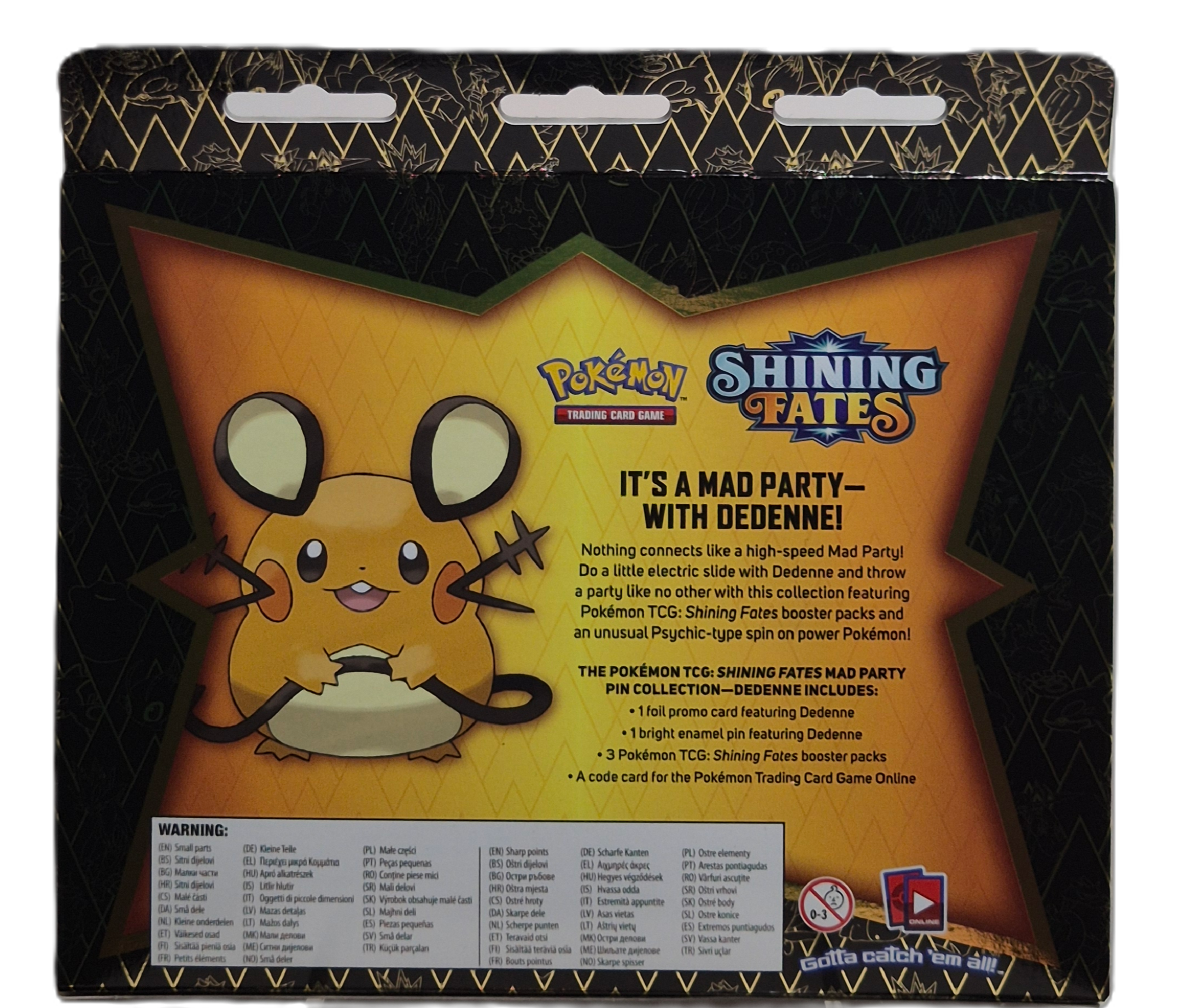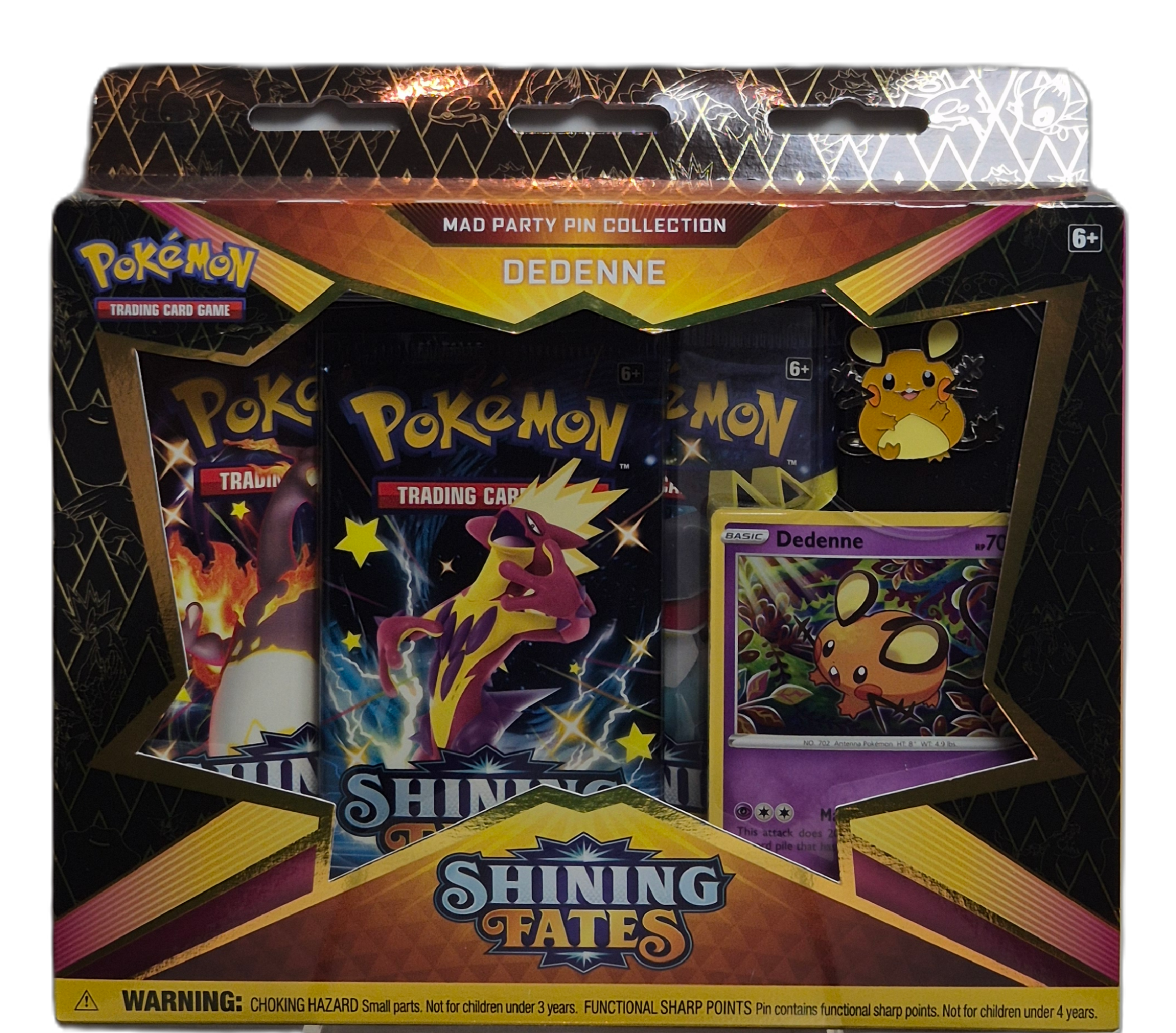Shining Fates: Mad Party Pin Collection – Dedenne är en populär specialbox från Shining Fates-serien. Boxen innehåller ett exklusivt Dedenne-promokort, en samlarpin och flera booster packs med chans på Shiny Pokémon och eftertraktade kort.