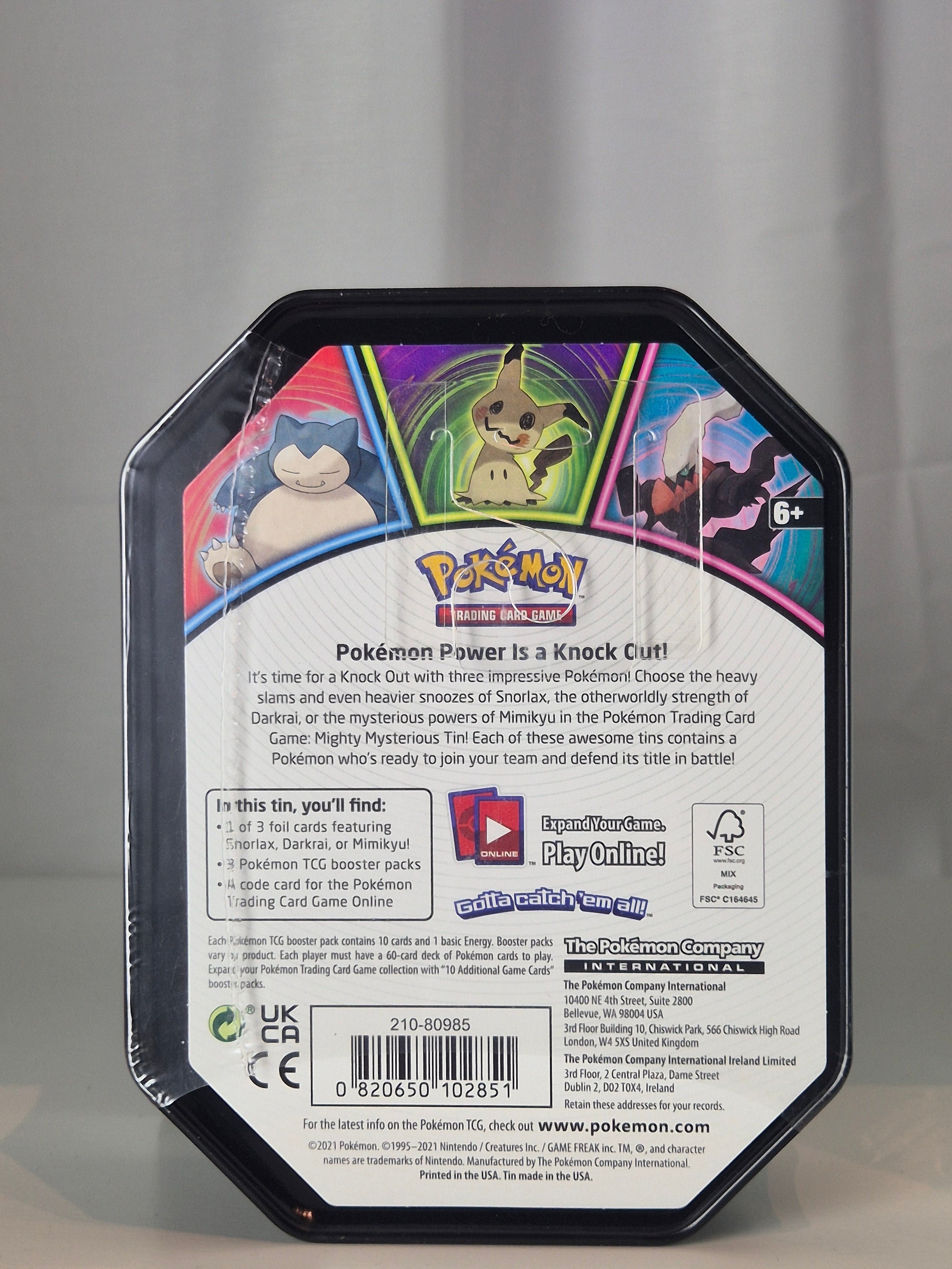 Mighty Mysterious Tin med Darkrai, den mytomspunna Dark-typen från Sinnoh. En populär tin från Sword & Shield-eran som släpptes tillsammans med Snorlax och Mimikyu, uppskattad för sitt tema och samlarvärde.