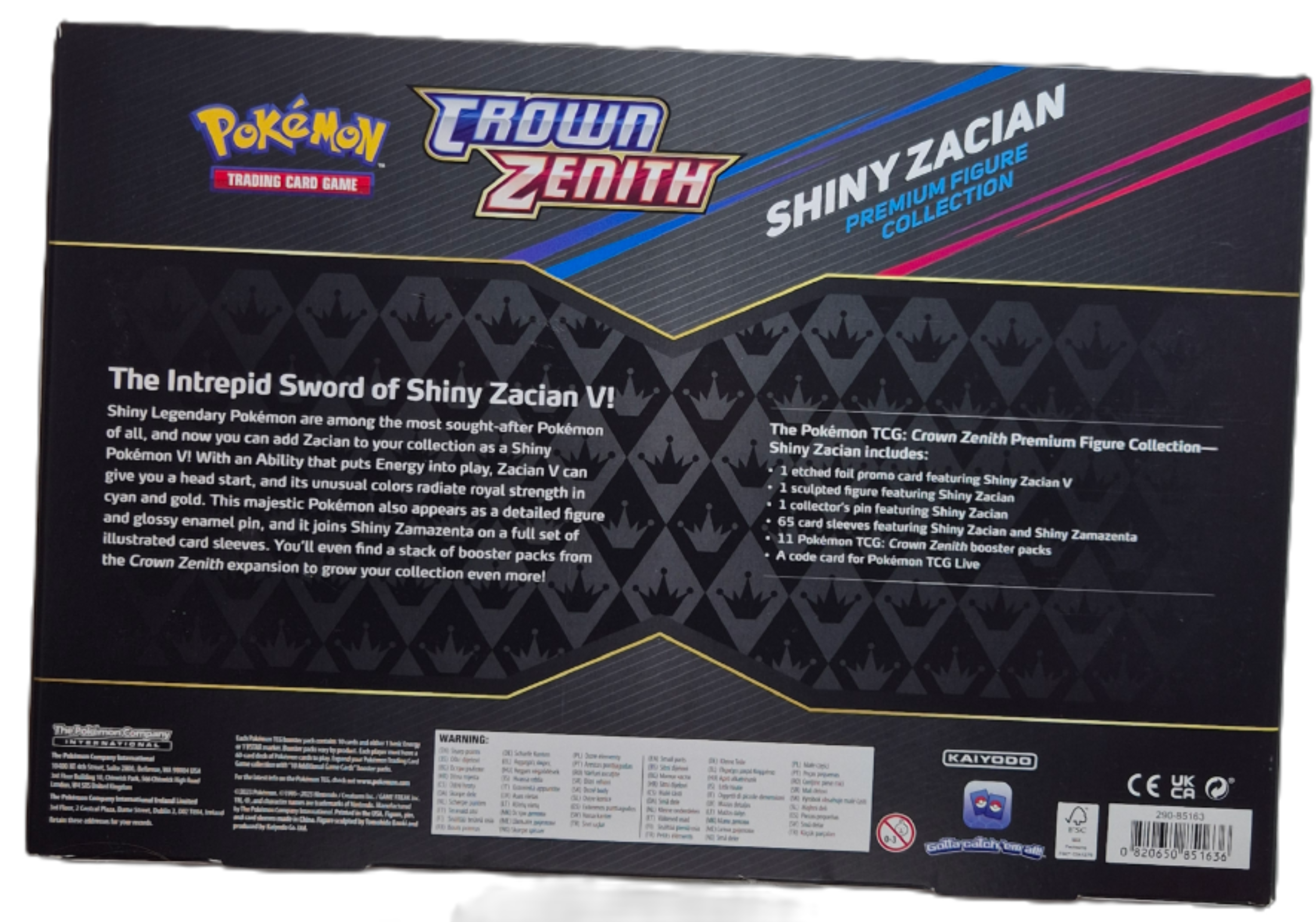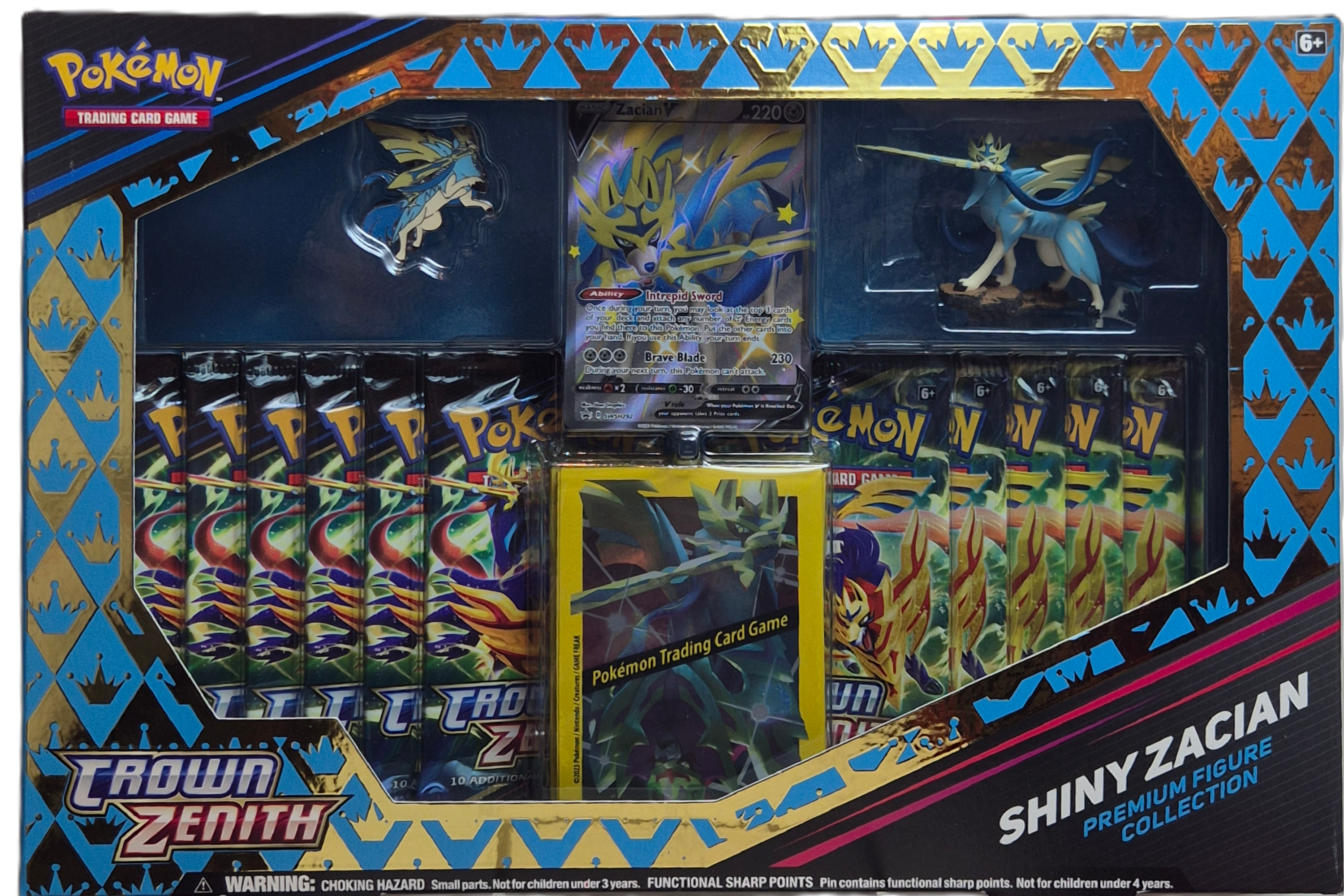 Crown Zenith – Shiny Zacian Premium Figure Collection är en mycket populär premiumbox från Crown Zenith-serien, känd för sina exklusiva shiny Pokémon och starka samlarvärden. Boxen fokuserar på Shiny Zacian och innehåller både promokort, samlarfigur och ett stort antal Crown Zenith-booster packs. Extremt eftertraktad bland både samlare och spelare.