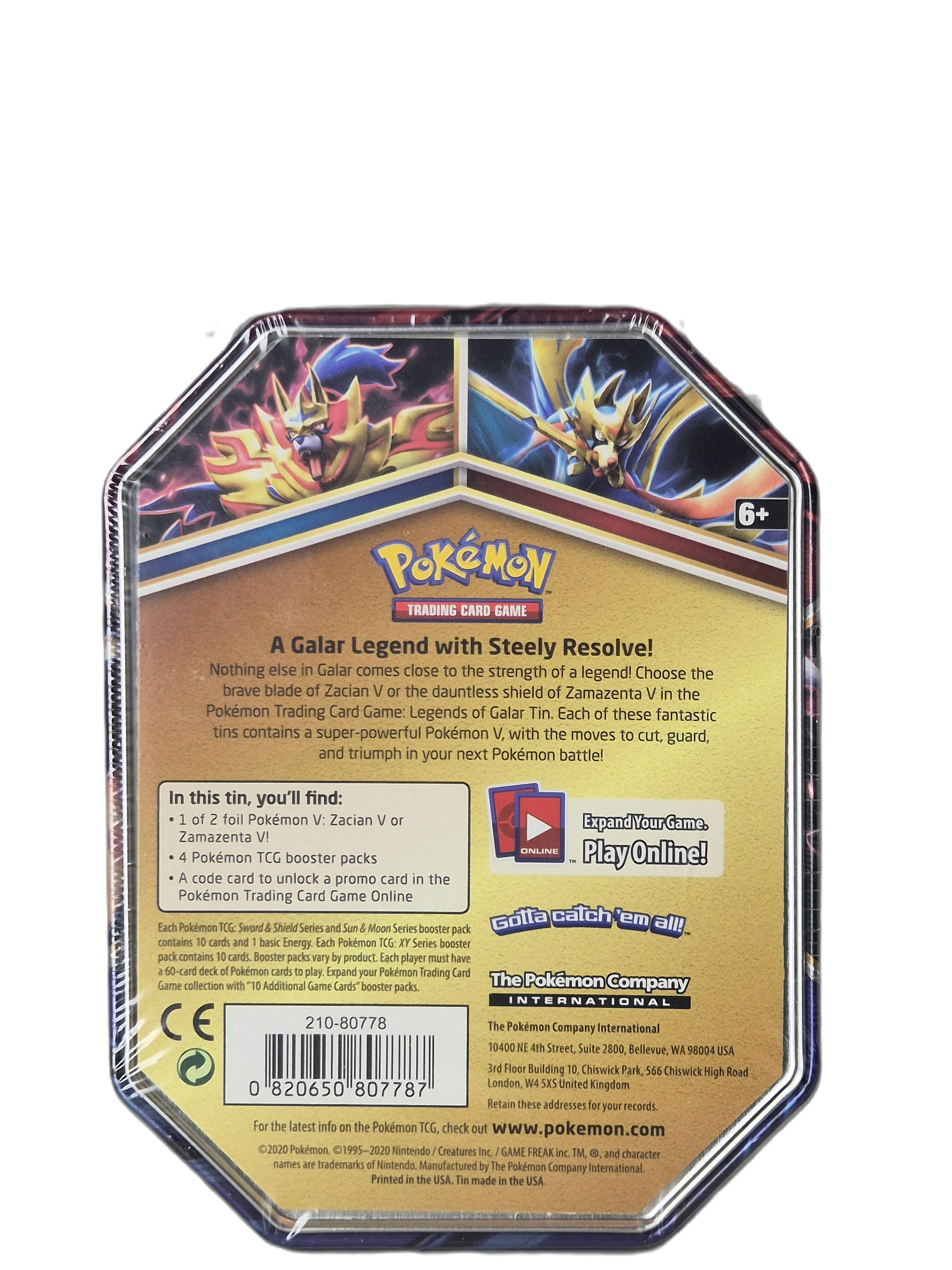Legends of Galar Tin med Zamazenta V, en Legendary Pokémon från Sword & Shield-eran. Denna tin släpptes tillsammans med Zacian V och är ett populärt samlarobjekt från Galar-generationen, uppskattad både för sitt artwork och sitt innehåll.